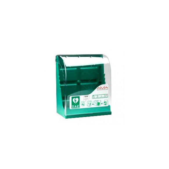 Na frente transparente está o número de emergência com três pictogramas que mostra em três etapas como abrir e tirar o desfibrilador