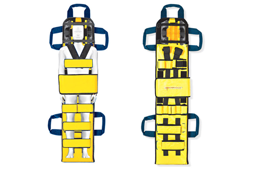 A plataforma interna em madeira de bétula do sistema de imobilização Pedi Loc possui revestimento náutico, que evita qualquer tipo de impregnação de fluidos corporais. Uma camada de poliuretano prensado e laminado proporciona um alinhamento natural da coluna, oferecendo maior conforto e segurança à vítima pediátrica, ou seja, ao menino ou menina atendido.