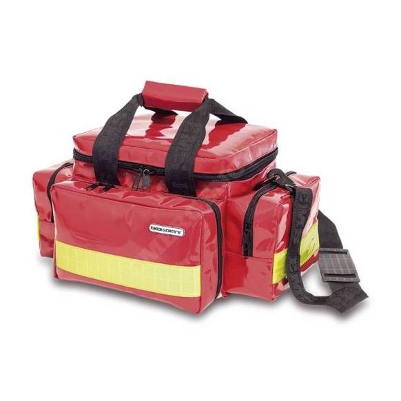 Possui duas divisórias internas reguláveis e um bolso de rede na aba para facilitar a organização do material médico, além de três bolsos externos, dois deles abertos e um frontal subdividido internamente e com elásticos.